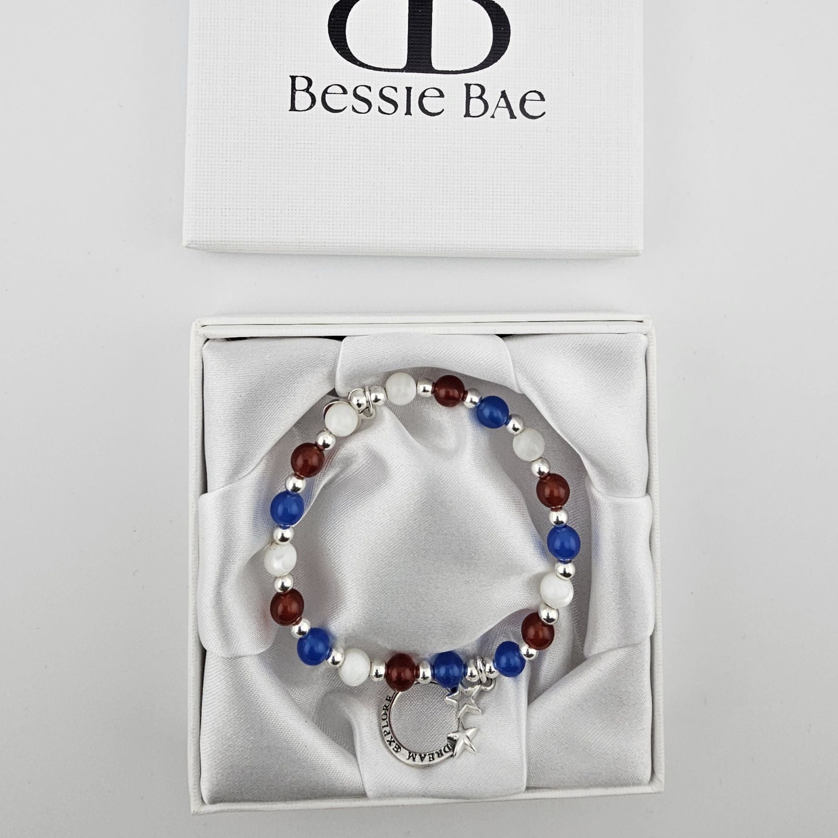 Wrist wearing a Bessie Bae silver moon and stars charm bracelet with red, blue, and white beads on a wooden surface.
