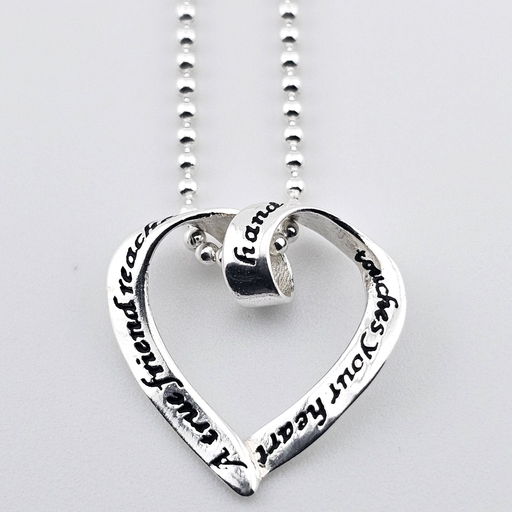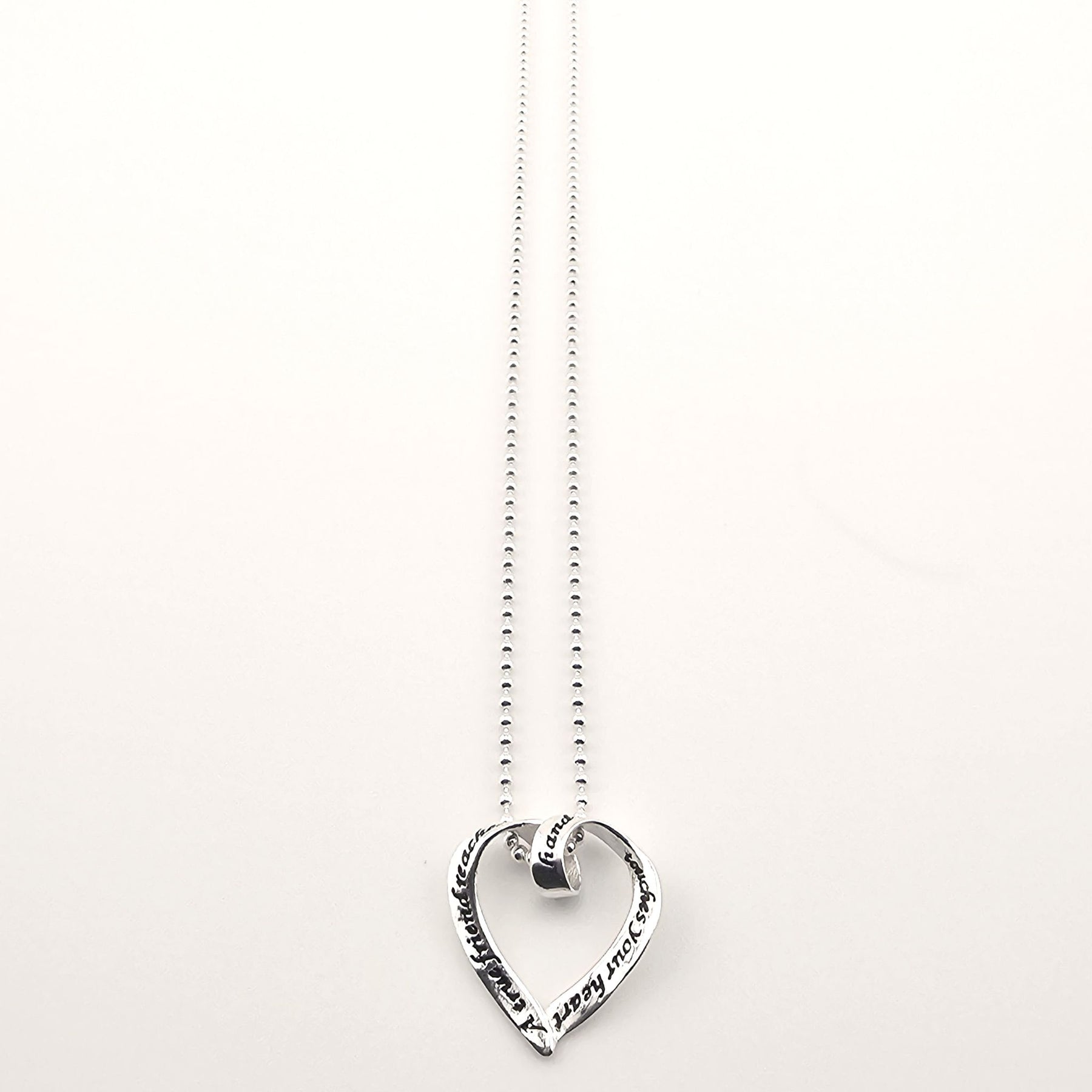 Sterling silver heart pendant necklace with engraved love message on chain.
