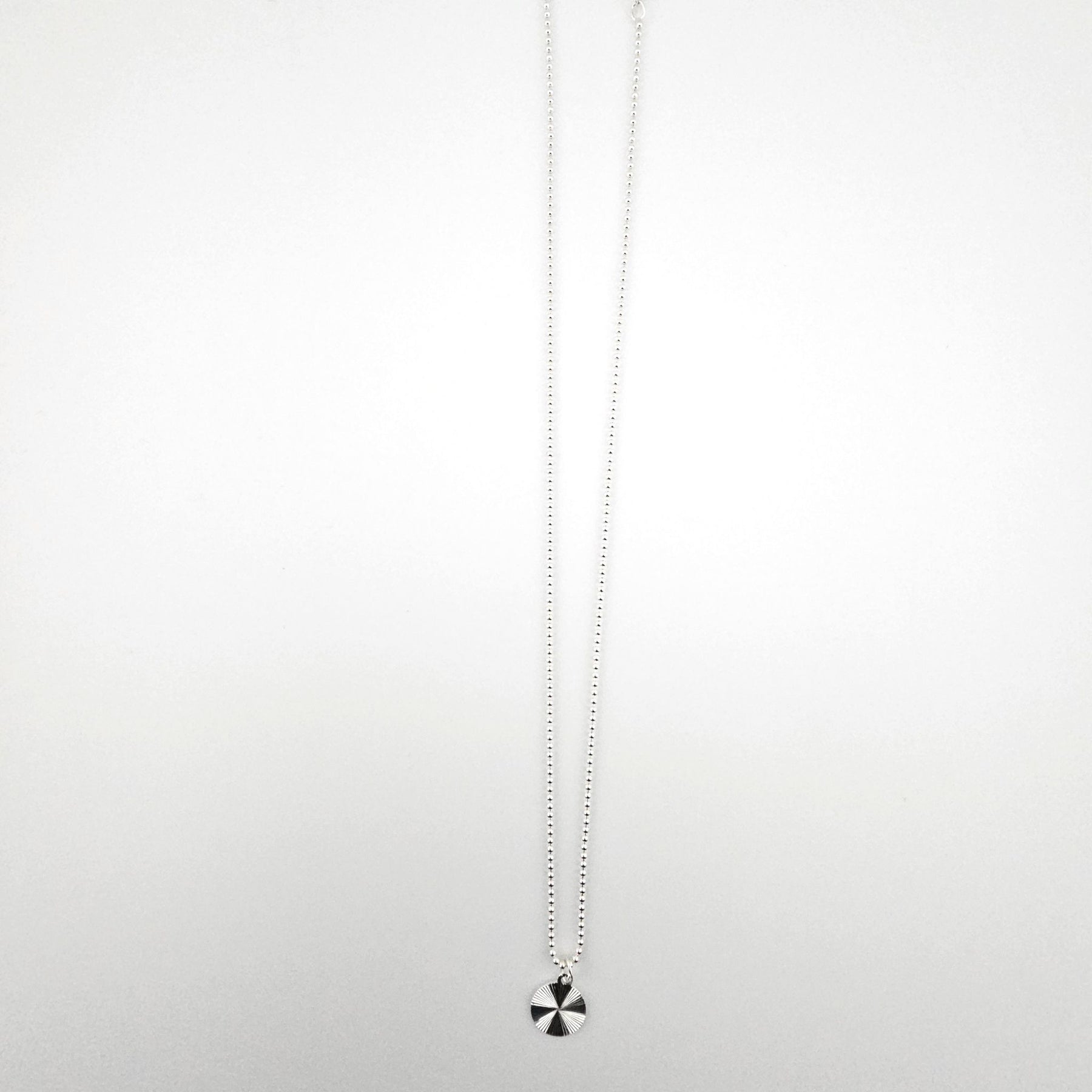 Sterling silver starburst disc necklace with 12mm charm on an 18 inch ball chain.