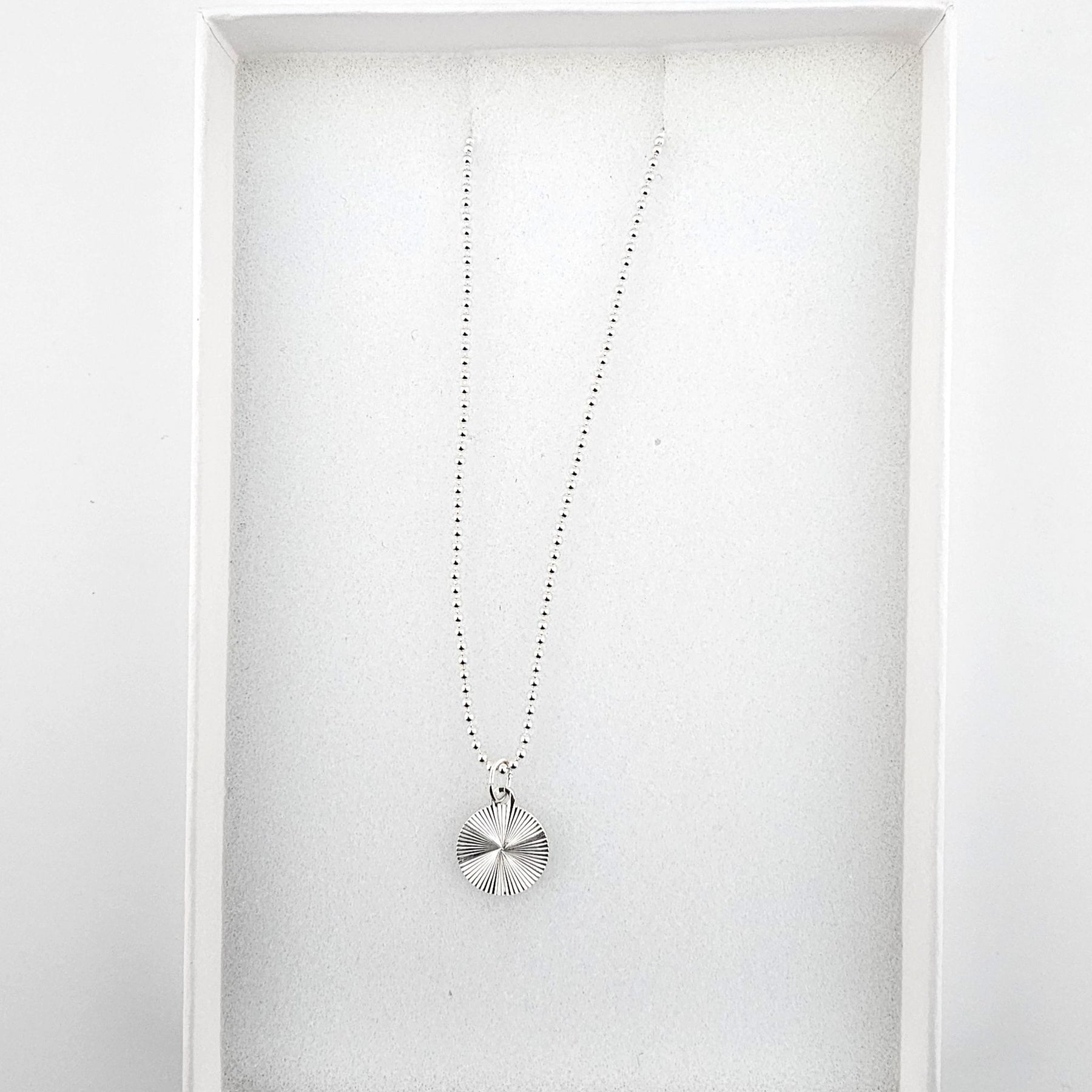 Starburst disc sterling silver necklace in Bessie Bae branded gift packaging.