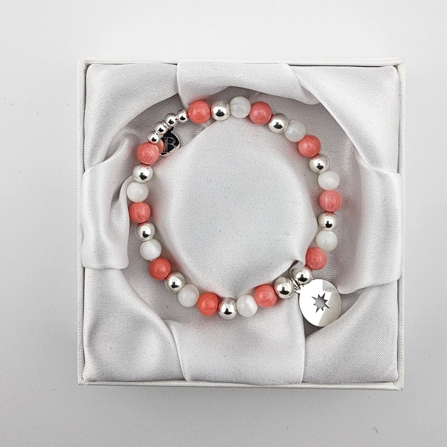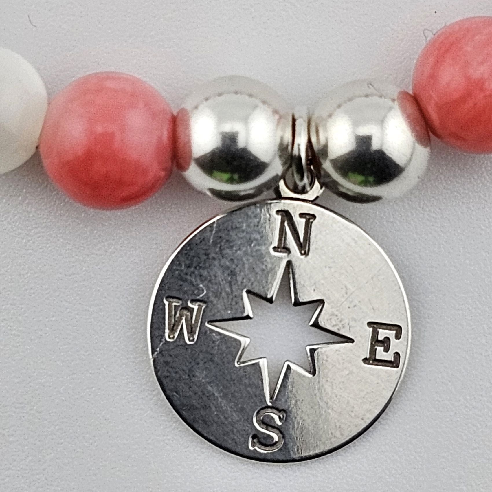Handcrafted in the UK from solid 925 sterling silver, this bracelet features a polished compass charm paired with luminous mother of pearl and warm coral-hued gemstone beads. Each element represents light, intuition, and emotional balance — a reminder to follow your true path.