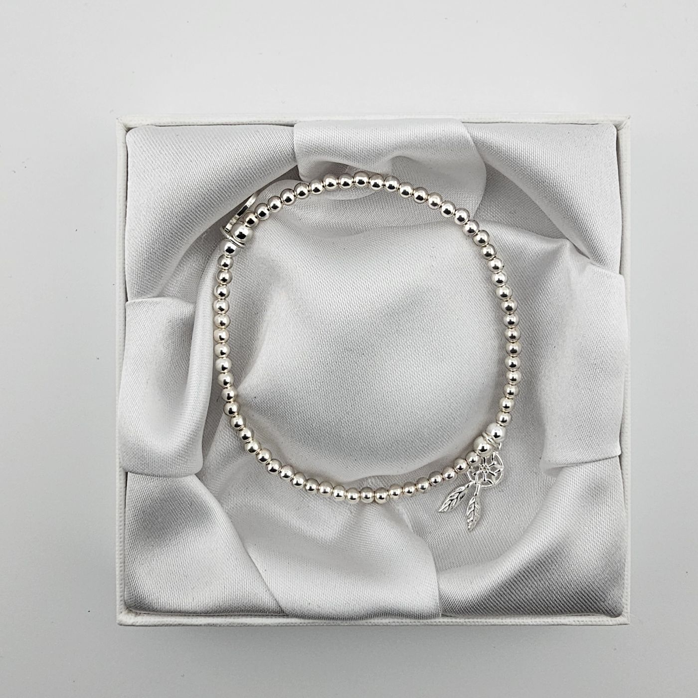 Capture your dreams in silver. This elegant Sterling Silver Dreamcatcher Bracelet is crafted from polished 925 silver beads and features a delicately detailed dreamcatcher charm — a symbol of protection, positivity, and good fortune.
