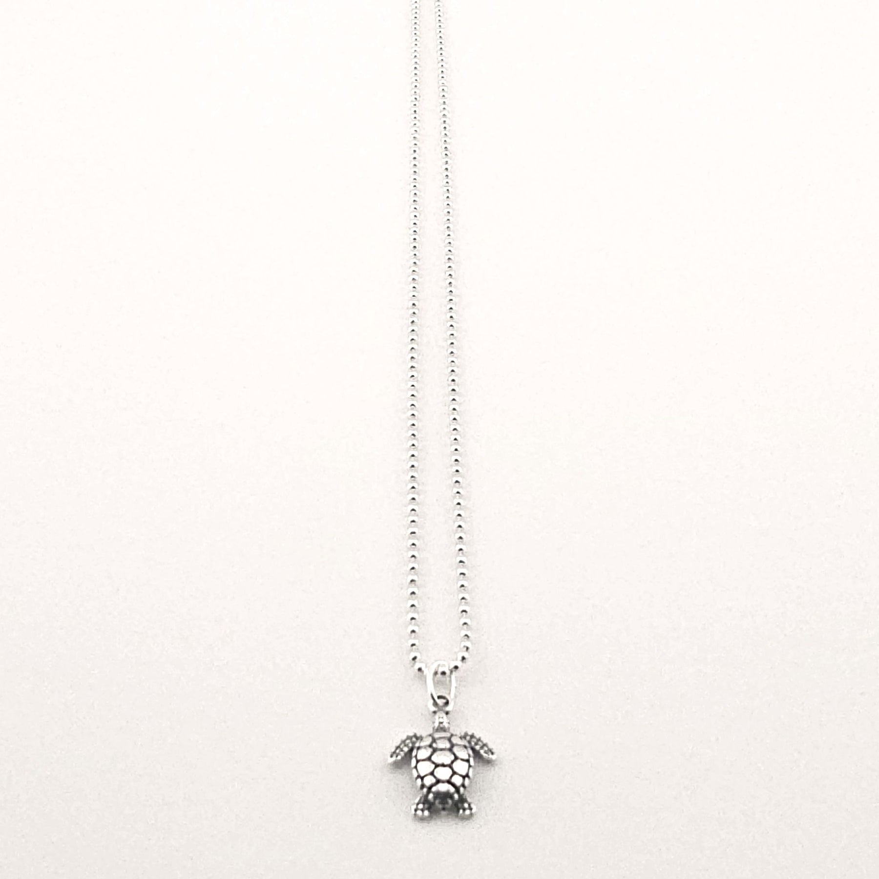 Close-up of sterling silver sea turtle necklace, ocean-inspired jewellery.