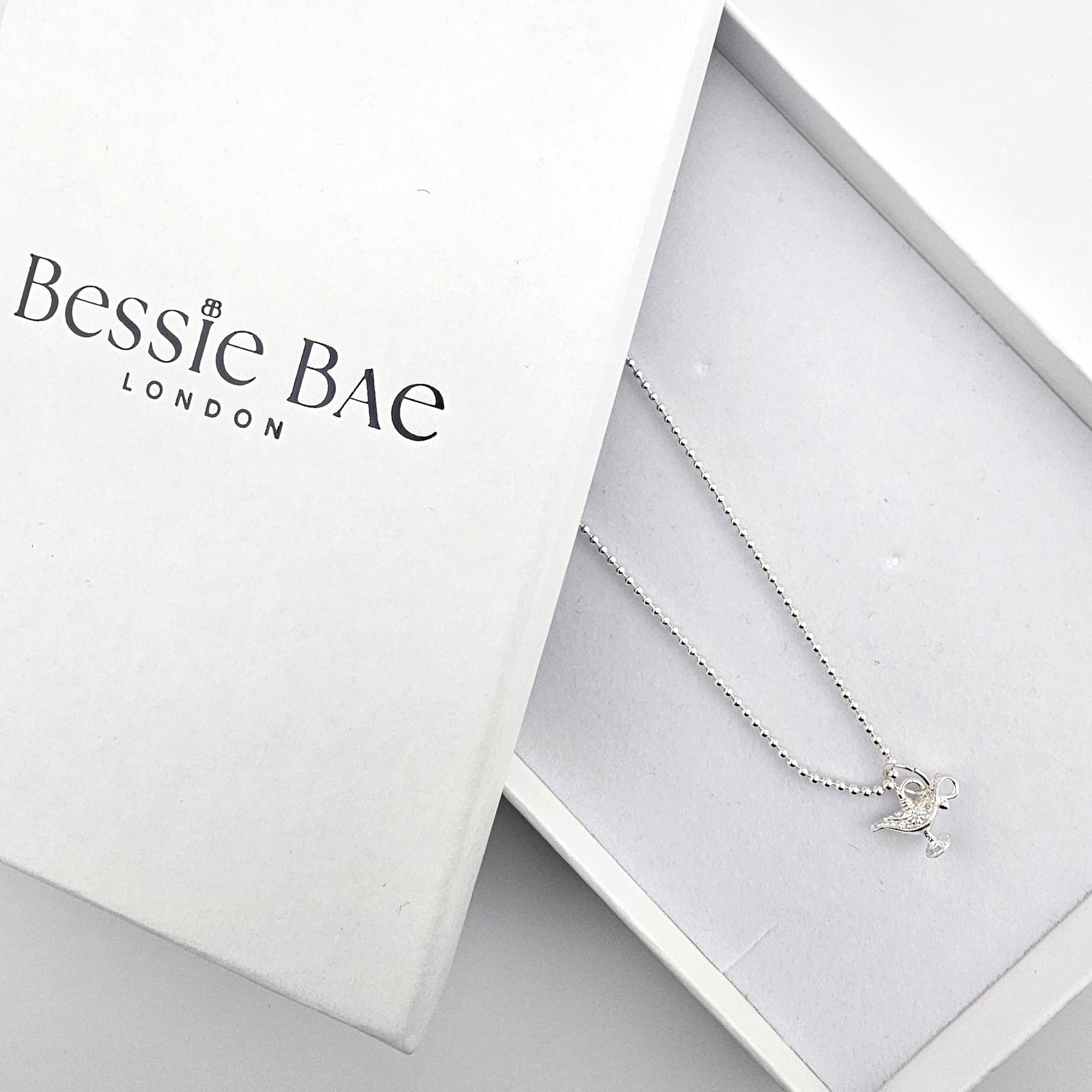 Crafted in sterling silver, the sculptural lamp hangs delicately from a fine silver ball chain — a reminder that dreams, hopes, and new chapters are always within reach. Subtle and meaningful, this piece is designed to be worn close, as a personal talisman rather than a statement.