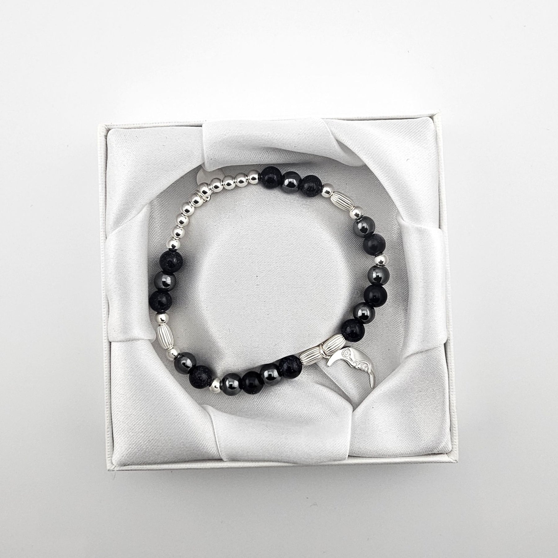 Connect with the night sky through our Sterling Silver Crescent Moon Bracelet, handcrafted by Bessie Bae. This celestial-inspired design features shimmering Blue Goldstone and grounding Hematite gemstones, beautifully complemented by polished sterling silver beads. The detailed crescent moon charm adds a touch of mystery and calm — a symbol of intuition, renewal, and feminine energy.