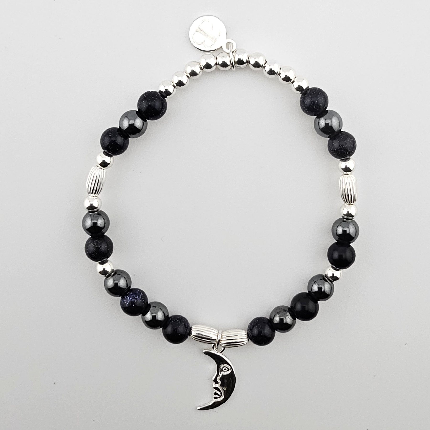 Sterling Silver Crescent Moon Bracelet with Blue Goldstone & Hematite